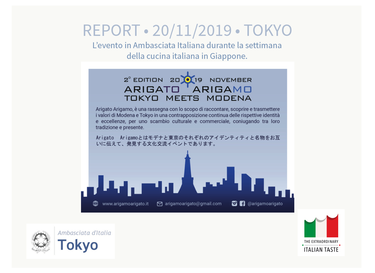 ArigaTo ArigaMO, è una rassegna con lo scopo di raccontare, scoprire e trasmettere i valori di Modena e Tokyo in una contrapposizione continua delle rispettive identità e eccellenze, per uno scambio culturale e commerciale, coniugando tra loro tradizione e presente.